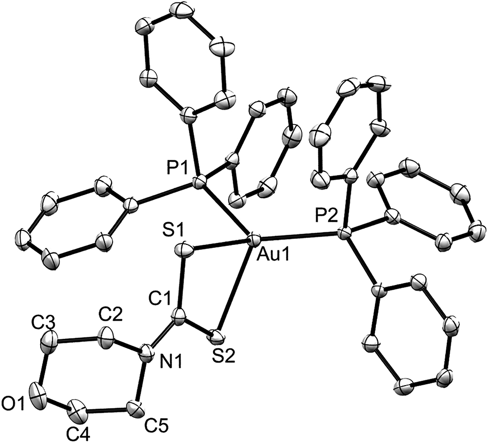 Dithiocarbamates (R2NCS2) are very versatile monoanionic ligands which form stable metal complexes with all classes of metal. It is the most common class of monoanionic 1,1-dithiolate ligands. Other classes include carbamates, xanthates, dithiophosphates, dithiophosphonates, among others [5]. The upsurge in the number of dithiocarbamate derivatives prepared so far stems from the ability to vary the substituents on the nitrogen atom [6]. The ease of synthesis and ability to modify the ligand has made this ligand prominent in coordination chemistry. The DTC ligand is capable of bonding to low-valent metals and has diverse coordination modes. There are nine possible coordination modes observed for DTC, but only six are prominent in the literature [7]. DTC can act as a monodentate as well as a bidentate in a monometallic system. In the bidentate system, (the most common coordination mode) the ligand coordinates to the metal via its two sulfur atoms forming two approximately equivalent metal-sulfur bonds with the metal–sulfur distance ranging from 2.25–2.55 Å and a small bite angle (S–M–S) in the range 60–80°. The chemistry of gold dithiocarbamate complexes has been extensively studied [5], [6], [7], [8] owing to their antitumor/anticancer properties [914], as precursors for gold nanoparticle synthesis [15, 16]. Several structures of gold dithiocarbamate complexes have been reported to date but only a few have been reported with triphenylphosphine [1720].