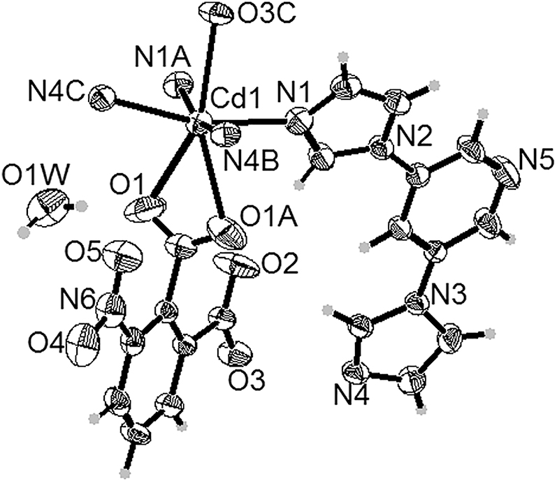 The single-crystal X-ray analysis shows that the title complex crystallizes in orthorhombic crystal system and features a one-dimensional chain. The asymmetric unit contains a half Cd(II) ion, a half 3–Nbdc dianion, one bip molecule, and one guest water molecule, as shown in the figure (A: x, 0.5 − y, z; B: 0.5 + x, y, 1.5 − z; C: 0.5 + x, 0.5 − y, 1.5 − z). The Cd(II) ion is seven coordinated by three oxygen atoms and four nitrogen atoms. Among them, three oxygen atoms are from two symmetry-related 3–Nbdc dianions, and the other four nitrogen atoms are from three symmetry-related bip ligands. The seven-coordinated Cd(II) ion forms a slightly distorted single cap octahedral [CoN4O3] geometry with the four atoms (N1, N1A, N4B, N4C) in the equatorial plane and the other three atoms (O1, O1A, O3B) in the axial position (see the Figure). The Cd–O bond lengths are 2.551(2) and 2.543(2) Å, whilst the Cd–N bond lengths are 2.317(2) and 2.3304(19) Å, respectively. The bond angles around the Cd centers range from 50.02(10) to 164.94(7)°.