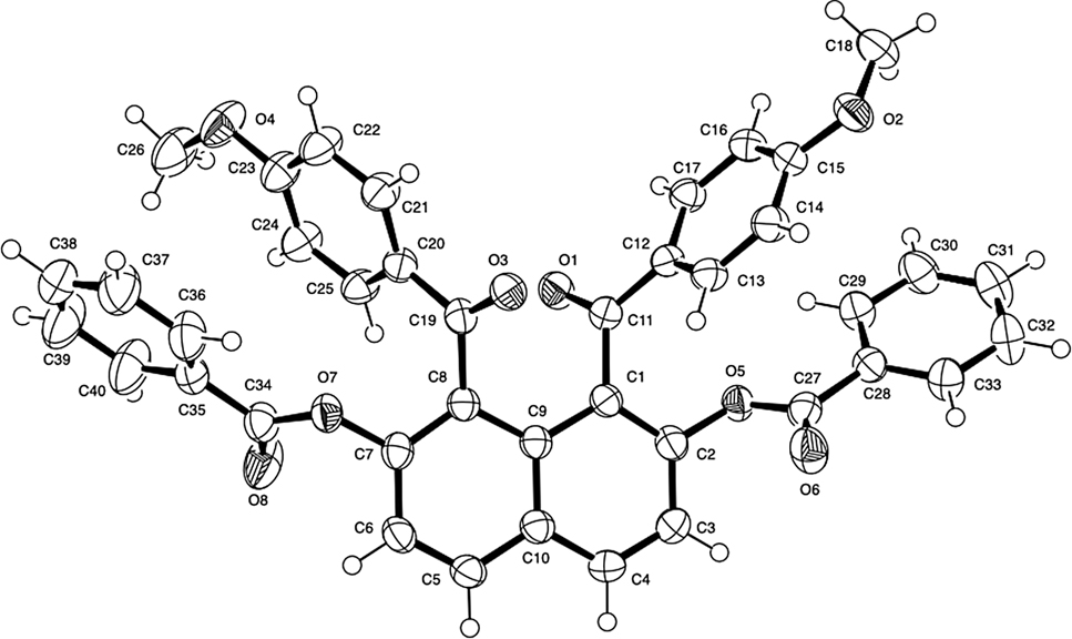 Home The crystal structure of 1,8-bis(4-methoxybenzoyl)naphthalene-2,7-diyl dibenzoate, C40H28O8