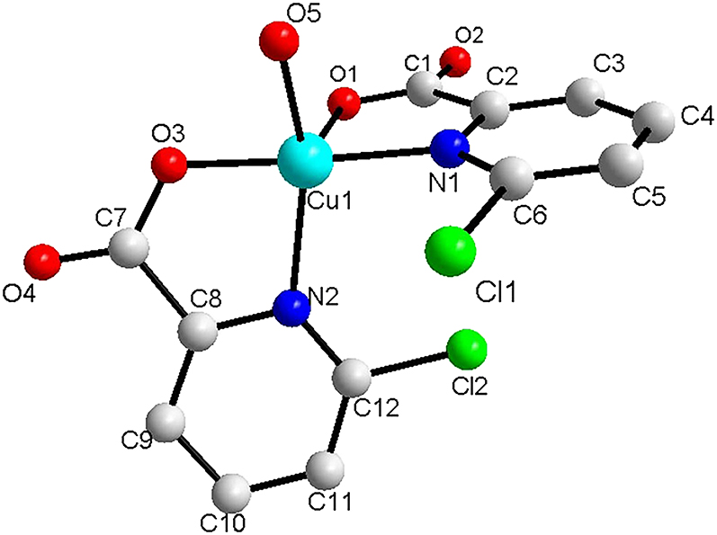 Single crystal X-ray diffraction analysis demonstrates that the asymmetric unit of the title structure contains one copper(II) cation, two 6-chloropyridine-2-carboxylate ligands and one H2O ligand. The bond distances of Cu–N are 1.9887(17) and 2.1167(17) Å, bond lengths of Cu–O are 1.9154(16) to 2.0980(16) Å, respectively, which are similar with reference []. In the title complex, the bond angles of O(3)-Cu(1)-N(1), O(5)-Cu(1)-N(2), O(3)-Cu(1)-O(1), N(1)-Cu(1)-O(1), O(5)-Cu(1)-O(1) and O(1)-Cu(1)-N(2) are 177.06(6)°, 145.02(8)°, 99.31(6)°, 80.70(6)°, 107.00(8)° and 107.53(7)°, respectively, which suggests a distorted square-pyramidal geometry [12].