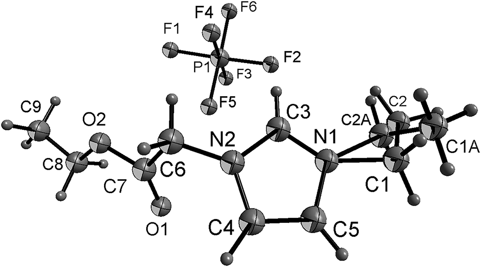 In the title structure bond lengths and angles within 3-(2-ethoxy-2-oxoethyl)-1-ethyl-1H-imidazol-3-ium and in the counter anion hexafluoridophosphate(V) are very similar to those given in the literature for 3-(2-ethoxy-2-oxoethyl)-1-vinyl-1H-imidazol-3-ium hexafluoridophosphate(V) [5], [18]. The atoms of the imidazole moiety are coplanar, and the dihedral angle of the imidazole ring and the carboxylate group is 58.8(2)°. The torsion angles of C3–N2–C6–C7, N2–C6–C7–O2, C6–C7–O2–C8, and C7–O2–C8–C9 are 116.0(3)°, −167.8(2)°, −179.9(3)° and 174.3(4)°, respectively.