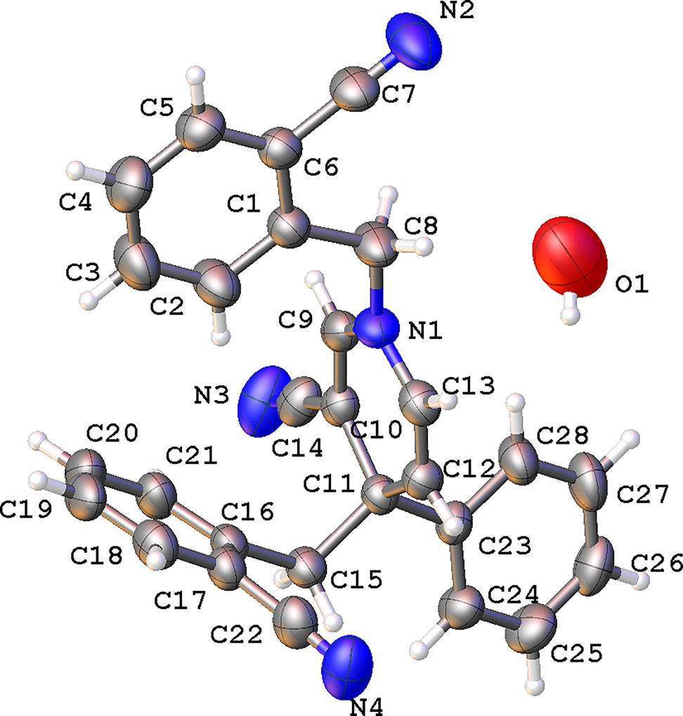 Home Crystal structure of 1-(2-cyanobenzyl)-3-cyano-4-phenyl-4-(2-cyanobenzyl)-1,4-dihydropyridine monohydrate, C56H42N8O