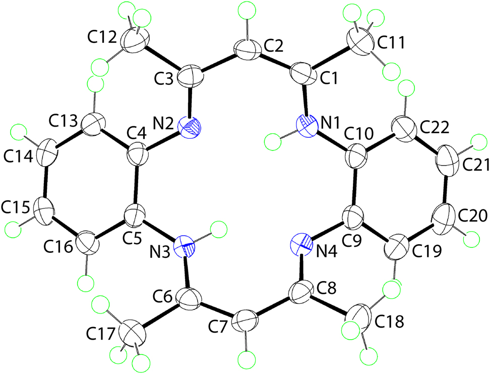 - Redetermination of the crystal structure of (2E,4Z,13E,15Z)-3,5,14,16-tetramethyl-2,6,13,17-tetraazatricyclo[16.4.0.07,12]docosa-1(22),2,4,7,9,11,13,15,18,20-decaene, C22H24N4