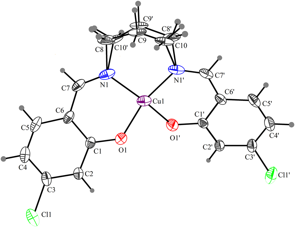- Crystal structure of [6,6′-((1E,1′E)-(propane-1,3- diylbis(azaneylylidene))bis(methaneylylidene)) bis(3-chlorophenol)-κ4N,N′,O,O′] copper(II), C17H14Cl2CuN2O2