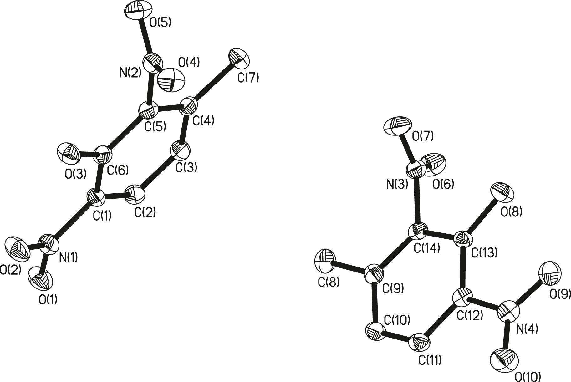 As shown in Figure, the crystal structure of the title compound was analyzed and refined using the SHELXL program [2], [3], [4]. In the title compound, the nitro group at position 2 of the original TNT has been removed and a hydroxyl group is added between the remaining two nitro groups. The formation of the title compound is due to the fact that in 2,4-dinitrotoluene, both nitro groups are electron-withdrawing groups, resulting in low electron density at position 3 between them, and the hydroxyl group is an electron-donating group. In the reaction, the hydroxyl group attacks the 3rd position and replaces H to form a hydroxyl group. Of course, there may be two main reasons for the formation of 2,4-dinitrotoluene. One is that TNT has removed a nitro group under alkaline conditions, the other is that this impurity still exists in the refined TNT raw materials. Bond lengths and angles are in the expected ranges [11].