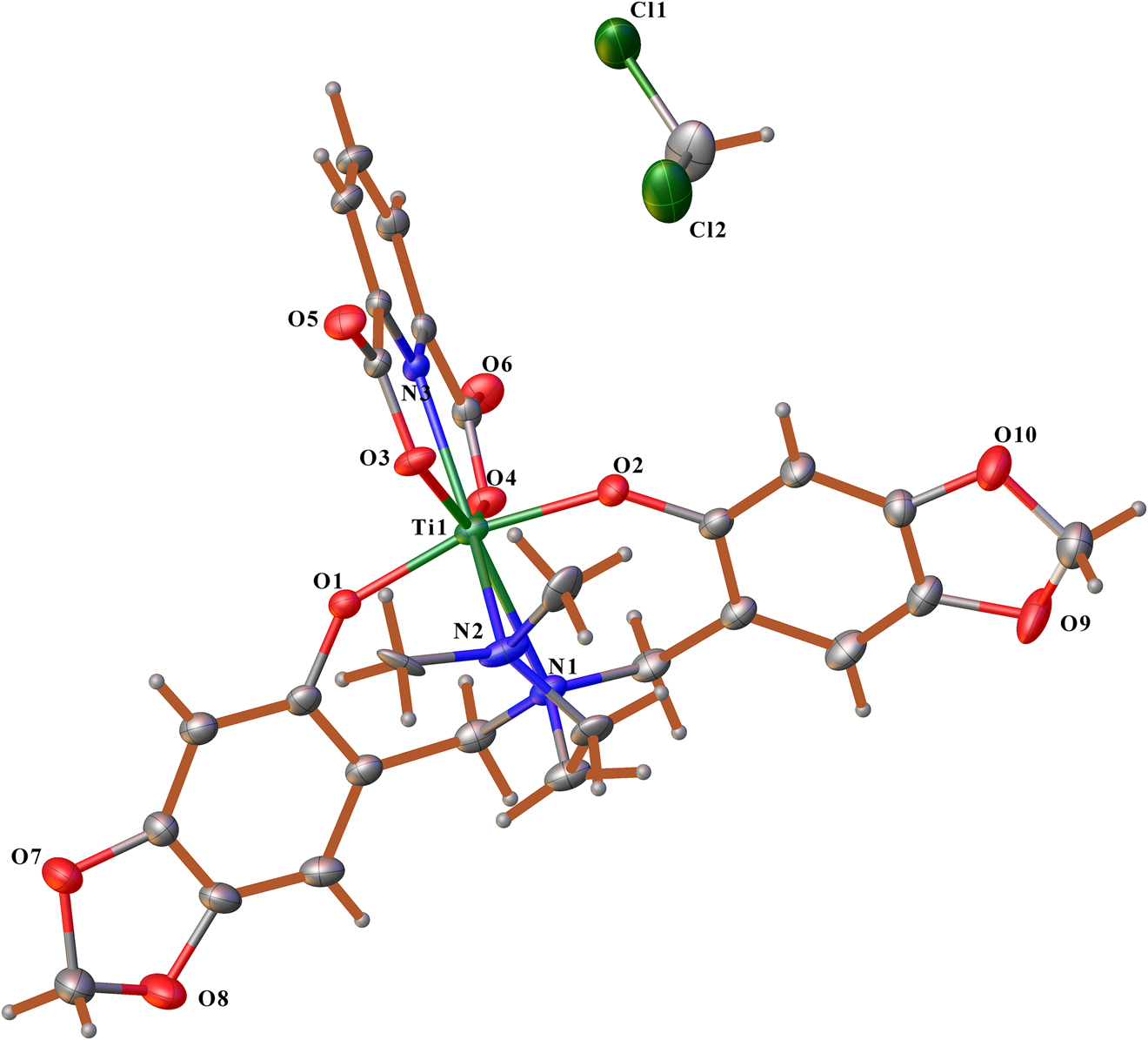 - The crystal structure of 6,6′-(((2-(dimethylamino)ethyl)azanediyl)bis(methylene))bis(benzo[d][1,3]dioxol-5-ol ato-κ4N,N′,O,O′)-(pyridine-2,6-dicarboxylato-N,O,O′)-titanium(IV)-dichloromethane(1/1), C27H25N3O10Ti