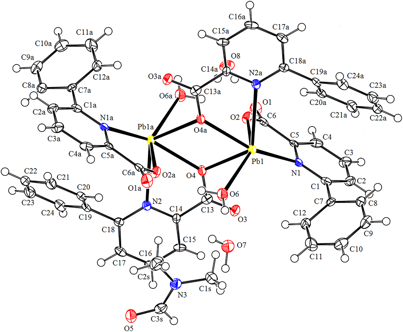 - Crystal structure of diaqua-bis(μ2-6-phenylpyridine-2-carboxylate-κ3N,O:O)-bis(6-phenylpyridine-2-carboxylato-κ2N,O)lead(II) – N,N-dimethylformamide – water (1/2/4), C54H58N6O16Pb2