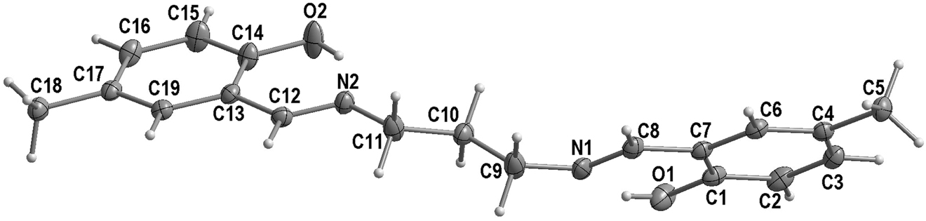 - Crystal structure of 2,2′-(propane-1,3-dilylbis(azaneylylidene))bis(methanylylidene)bis(4-methylphenol), C19H22N2O2