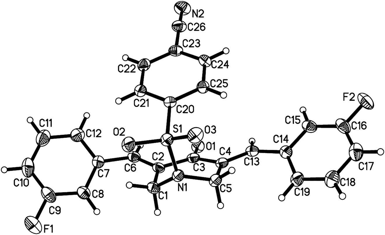 The title compound was obtained by the Claisen–Schmidt condensation of 4-piperidone and the appropriate aldehyde [4]. A mixture of 4-piperidone hydrochloride (0.68 g, 5 mmol), and 3-fluorobenzaldehyde (1.24 g, 10 mol) was dissolved in acetic acid (10 mL). The reaction was catalyzed by dry hydrogen chloride for 45 min. Then, the mixture was stirred continually at room temperature and monitored by thin layer chromatography (TLC). After the end of reaction, the solvent was removed by filtration and the residue was redissolved in water. The solution was adjusted to a neutral pH value with saturated Na2CO3 solution. Yellow precipitates were obtained and purified by silica gel column chromatography (methanol/petroleum ether/ethyl acetate = 1:10:10, v/v/v). The intermediate product (3,5-bis(3-fluorobenzylidene)piperidin-4-one) was dissolved in dichloromethane (100 mL). 4-Cyanobenzene-sulfonyl chloride (0.98 g, 5 mmol) and three drops of pyridine were added to the above solution. The mixture was stirred at room temperature (monitored by TLC). After 10 h, the reaction solution was concentrated under reduced pressure. The yellow solid was washed twice by distilled water and recrystallized from dichloromethane/methanol (1:1, v/v). Crystals were obtained by slow evaporation from the solution of dichloromethane and methanol (1:1, v/v) at room temperature.