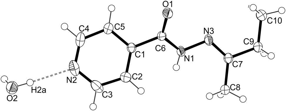 Isoniazid, a synthetic derivative of nicotinic acid [7] has been used as a frontline drug for the treatment of Tuberculosis (TB) for decades [8]. Tuberculosis-causing mycobacteria have developed resistance against this drug, thus there is an urgent need for novel and effective drug design and development. Modifying existing drugs to target resistant organisms intend to mitigate the deactivation process by the mycobacteria [9]. The crystal structure being reported in this article represents a covalent modification of isoniazid. The compound crystallizes in the orthorhombic Aba2 space group. The asymmetric unit shown in the figure is a hemihydrate, containing one organic target molecule and half a water molecule. The water sits in a special position in the unit cell, with a twofold rotation axis passing through the oxygen atom of the water molecule. Bond lengths and angles are all in the expected ranges [10, 11]. The crystal packing contains bilayers of (E)-N′-(butan-2-ylidene)isonicotinohydrazide alternating with layers of water molecules. Each carbohydrazide moiety is hydrogen bonded by a O2–H2a···N2 hydrogen bond to a water molecule to form the hemihydrate. Each carbohydrazide moiety is also hydrogen bonded via its N1–H donor to the carbonyl oxygen (O1) acceptor of an adjacent carbohydrazide moiety. The water present in the crystal is generated as a byproduct of the Schiff base reaction between isoniazid and butanone and is not added to the reaction mixture.