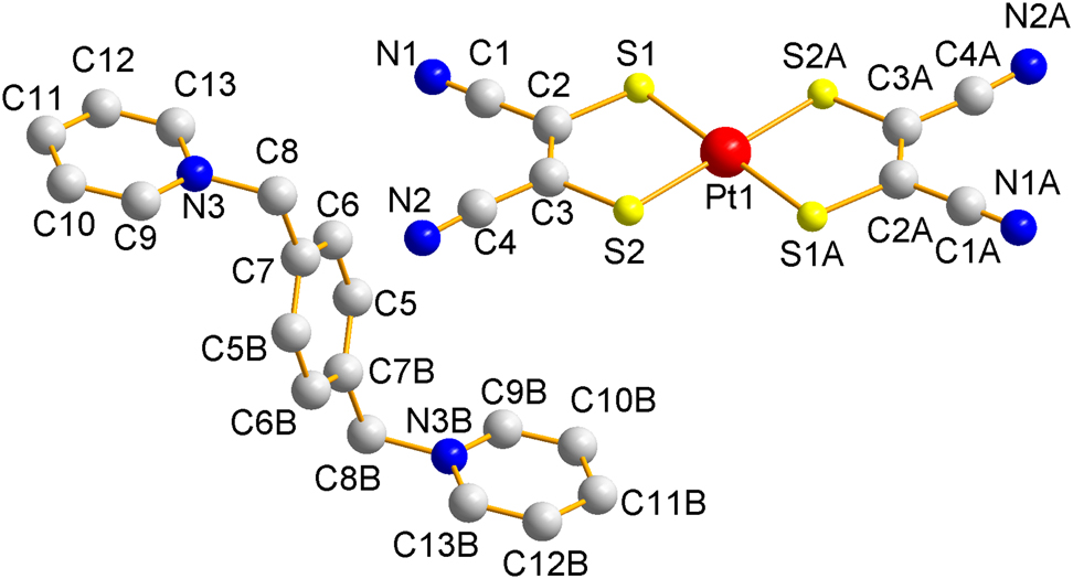 - Crystal structure of 1,1′-(1,4-phenylenebis(methylene))bis(pyridin-1-ium) bis(1,2-dicyanoethene-1,2-dithiolato-κ2 S,S) platinum(II), C26H18N6PtS4