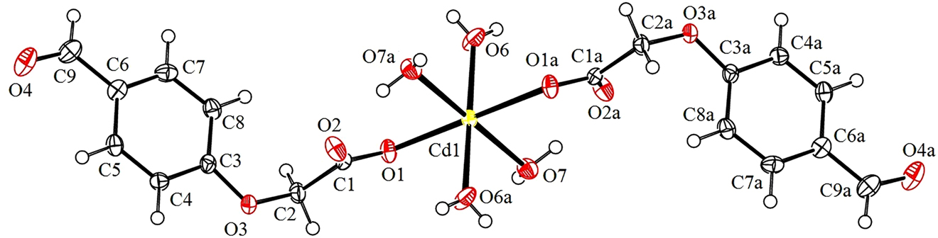 An amount of 0.180 g 4-formylphenoxyacetic acid (1.0 mmol) and 0.040 g NaOH (1.0 mmol) were dissolved into 15 ml ethanol-water (v:v = 2:1) solution with stirring at room temperature. After the solution was stirred for 1.0 h, 5 ml water solution of 0.150 g cadmium nitrate tetrahydrate (0.5 mmol) was added. The mixture was stirred for 6 h at 70 °C. The colorless crystals of the title compound were obtained through slow evaporation in 25 days.