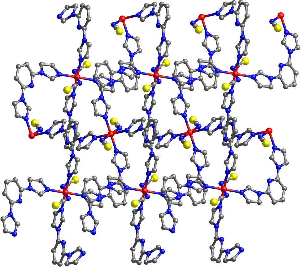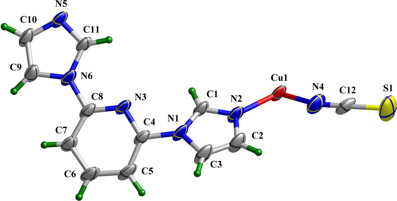 All the reagents were commercially available and used as received without further purification. About 13.5 mg CuSCN (0.1 mmol) and 10.3 mg NH4SCN (0.1 mmol) were dissolved in DMF (3 mL) with strong stirring to obtain a colorless solution. Then, 42.2 mg 2,6-bis(1-imidazoly)pyridine (2,6-BIP) (0.2 mmol) was added to the mixture, which turns into the blue-green solution immediately. After filtration, 1 mL DMF and 5 mL acetonitrile were added to the upper layer of the filtrate as buffer solution and diffusion solution, sequentially. Green crystals were obtained after a week at room temperature in the dark with a yield of 38 mg (64% based Cu). Anal. Calcd. for C24H18CuN12S2: C, 47.87%; H, 3.01%; N, 27.91%. Found C, 48.02%; H, 3.03%; N, 27.76%. IR (KBr, ν/cm−1): 2083(s), 2054(s), 1654(m), 1605(s), 1585(m), 1491(s), 1458(s), 1319(w), 1286(w), 1233(m), 1176(w), 1061(m), 1004(w) (pyridine: C=N), 849(w), 792(m), 743(w), 653(m).