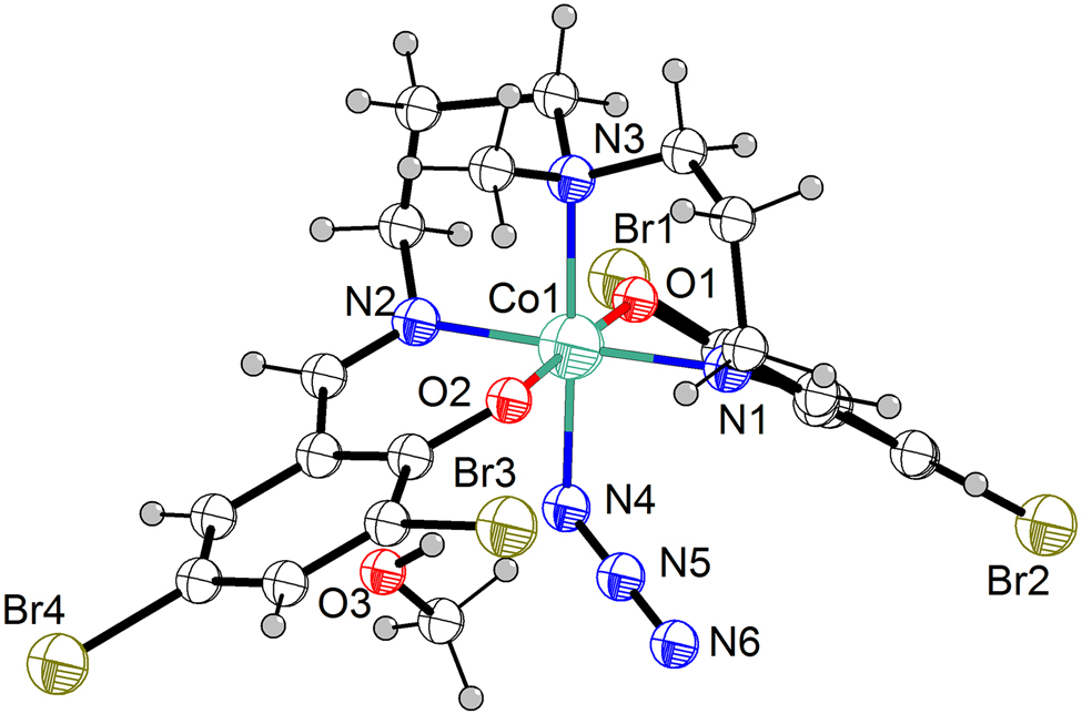 - Crystal structure of azido-k1 N-{6,6′-((((methylazanediyl)bis(propane-3,1-diyl))bis(azanylylidene))bis(methanylylidene))bis(2,4-dibromophenolato)k5 N,N′,N″,O,O′}cobalt(III)-methanol (1/1)), C21H23Br4CoN6O3
