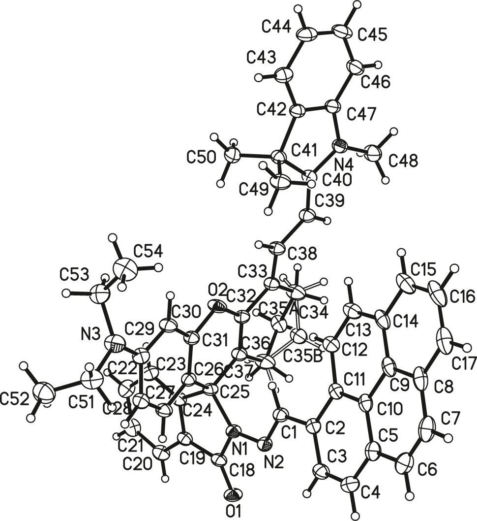 The asymmetric unit of the title compound only contains a neutral molecule in a closed-ring form. All bond lengths and angles are in the expected ranges [14, 15]. The amide C=O bond distance is 1.216(3) Å, indicative of the keto form of the amide. The bond length of C21–N2 is 1.285(3) Å, which shows the existence of the Schiff base C=N [14]. The xanthene least-square plane and the pyrene least-square plane dihedral angle is 68.6°. The dihedral angle between the aroylhydrozone plane and the pyrene plane is only 26.3°, which indicates that if the title compound coordinates with metals, it may be in the opened-ring form. Due to the large ellipsoid of the C35 atom, it was split into two parts with occupancy of 0.585(12) for C35A and 0.415(14) for C35B, respectively.