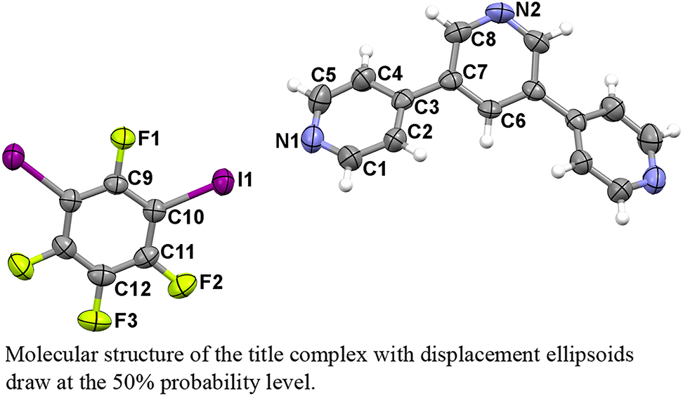 Home Halogen bonds in the crystal structure of 4,3′:5′,4″-terpyridine — 1,3-diiodotetrafluorobenzene (1/1), C21H11F4I2N3
