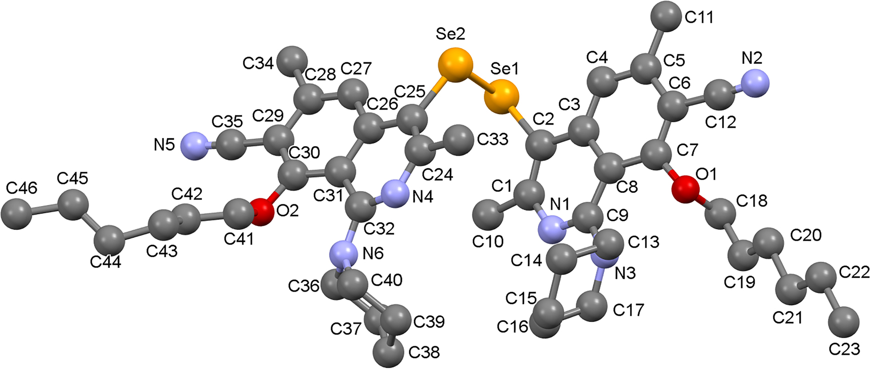 Home The crystal structure of 4,4′-diselanediylbis(8-(hexyloxy)-3,6-dimethyl-1-(piperidin-1-yl)isoquinoline-7-carbonitrile), C46H60N6O2Se2
