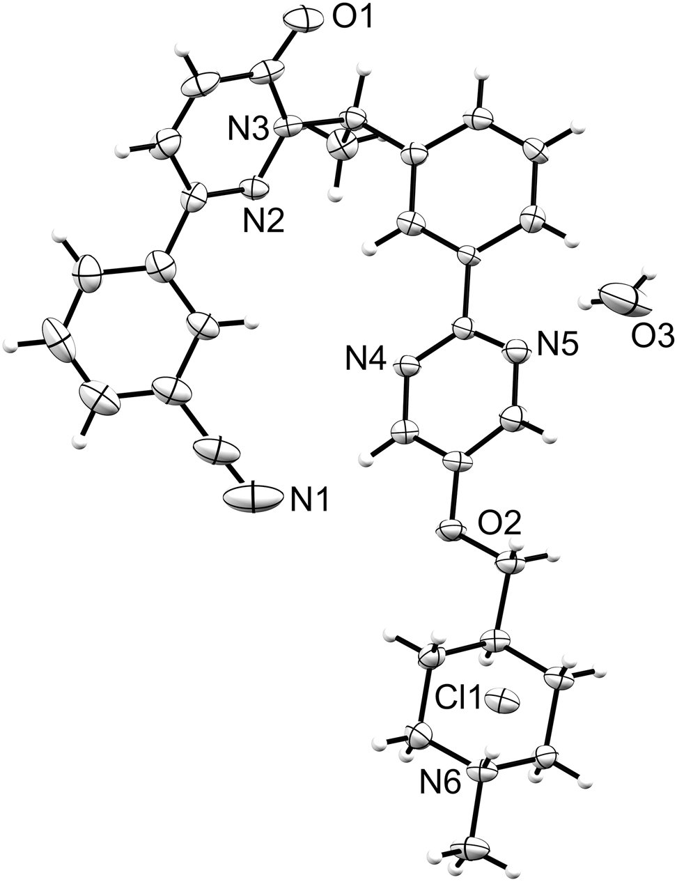 5. Crystal structure of 4-(((2-(3-(1-(3-(3-cyanophenyl)-6-oxopyridazin-1(6H)-yl)ethyl)phenyl) pyrimidin-5-yl)oxy)methyl)-1-methylpiperidin-1-ium chloride monohydrate, C30H33N6O2Cl