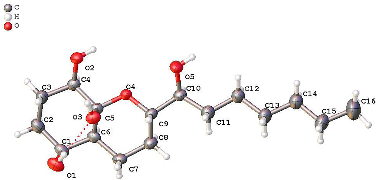 Home Crystal structure of (2-(1-hydroxyheptyl)octahydro-8aH-chromene-5,8,8a-triol), C16H30O5