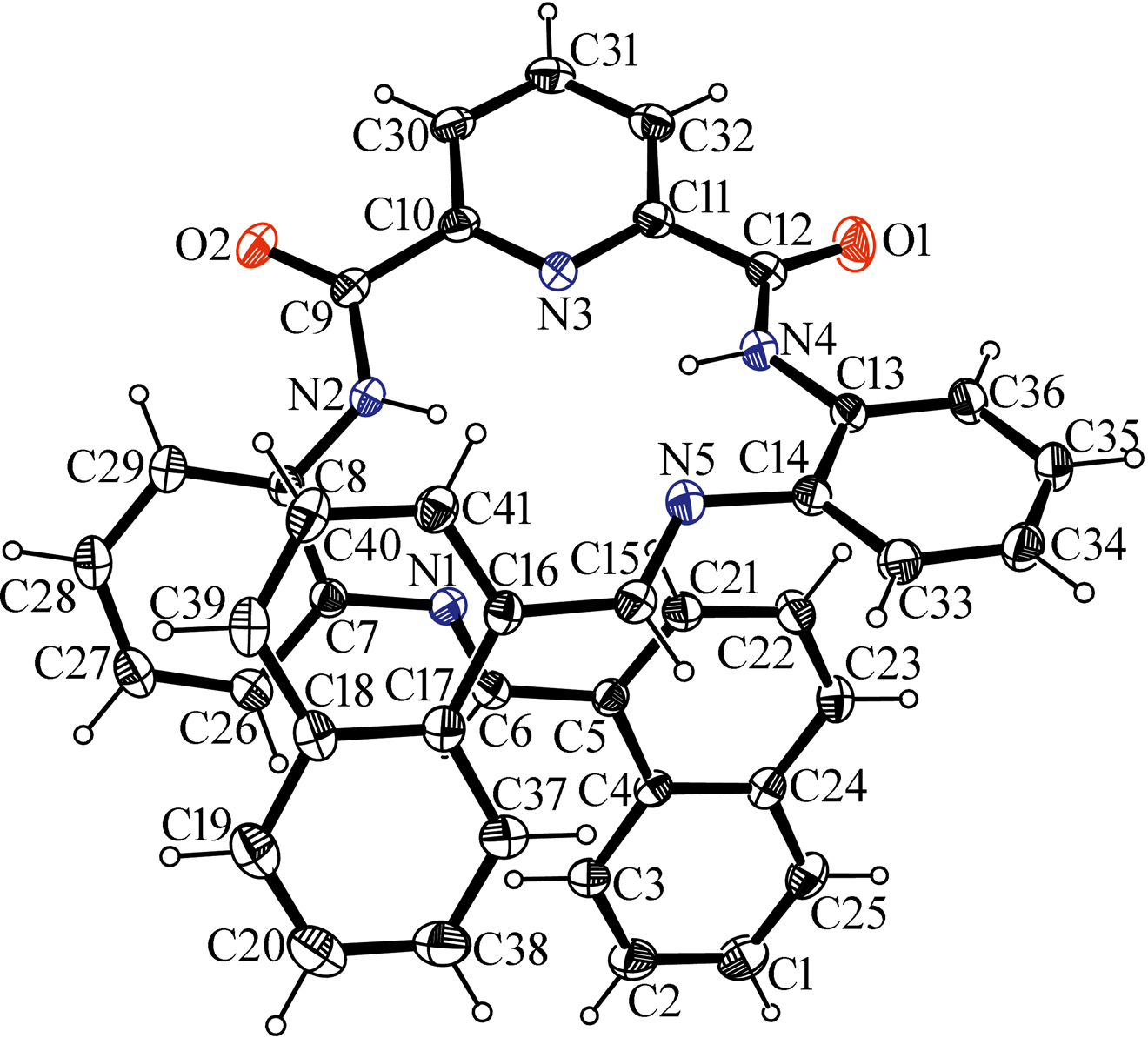 As reflected by the crystal structure, condensation reaction has occurred between the amino groups of N,N′-(2-aminophenyl)-2,6-dicarboxylimide pyridine and the aldehyde groups of 1-naphthaldehyde, forming the typical “S” structured compound (see the figure). The lengths of imine bonds C6=N1 and C15=N5 are 1.255 Å and 1.267 Å respectively. All bond lengths and bond angles are within the normal range [7, 8]. There are intramolecular hydrogen bonds of N2—H2⃛N1, N2—H2⃛N3, N4—H4⃛N3 and N4—H4⃛N5.