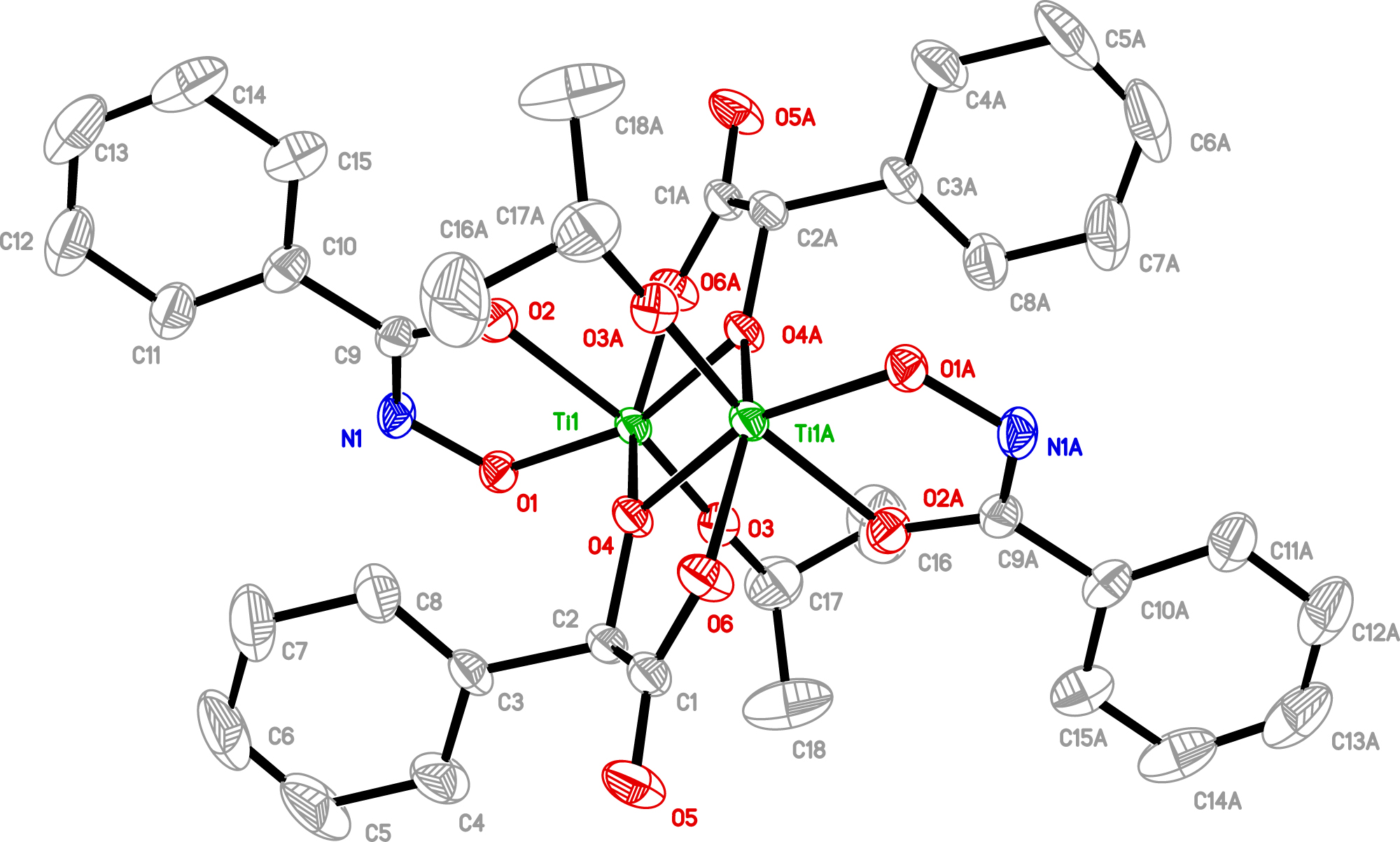 The X-ray crystal diffraction revealed that the title compound crystallizes in the monoclinic system. There is one six-coordinated Ti4+ ion, two one deprotonated benzohydroxamate, one mandelate and one isopropoxide groups in the asymmetric unit. The dinuclear title complex is furnished by an inversion center (see the figure). Thus the two Ti4+ present the same coordination environments featuring the octahedral TiO6 mode. The six coordinated oxygen atoms belong to two mandelate ligands, one deprotonated benzohydroxamate and one isopropoxide groups respectively. Two μ 2–O-type atoms link the two Ti4+ ions together wtith the distance of 3.211 Å which is very close to the reported 3.222 Å of the TOC based on mandelic acid, and the average bond length of Ti–O is 1.956, almost the same as 1.963 Å of the reported structure [16].