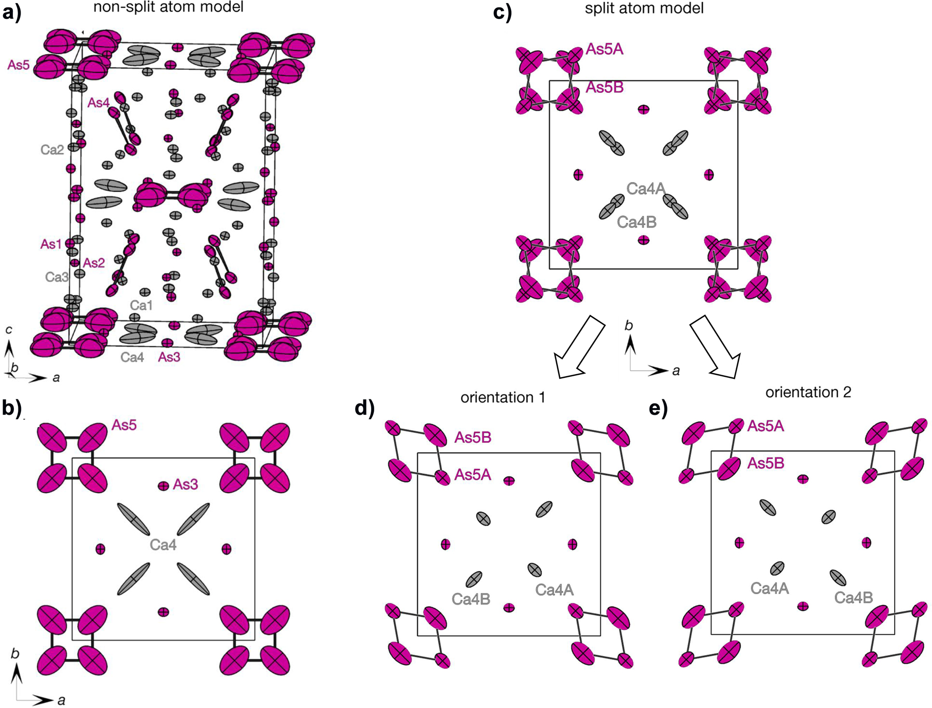Crystal structure of Ca11As10 (Ca – light gray and As – magenta): a) and b) non-split atom model; c)–e) split atom model. Atoms are represented as atomic displacement ellipsoids with 90% probability level. The covalent As–As bonds are shown in black.