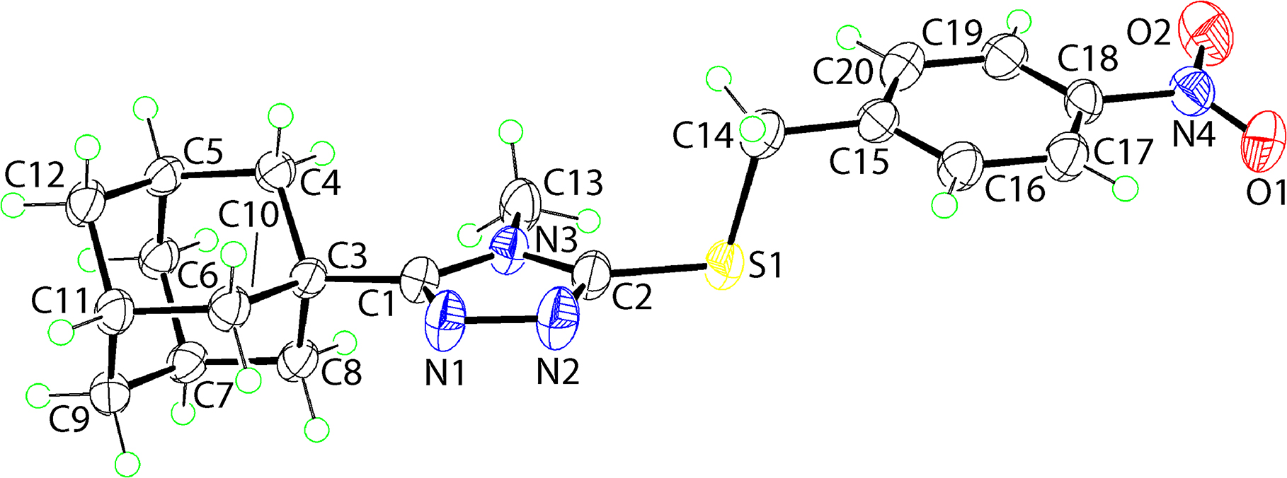 The molecular structure of (I) is shown in the figure (50% probability ellipsoids). The central 1,2,4-triazolyl ring is planar with a r.m.s. deviation for the five atoms being 0.004 Å with maximum deviations of ±0.003 Å noted for the N1 and C1 atoms. The C1–N1 and C2–N2 bond lengths of 1.323 (4) and 1.306 (4) Å, respectively, are experimentally equivalent, and systematically shorter than the C1–N3 and C2–N3 bond lengths of 1.364(4) and 1.371(4) Å, respectively, which are also experimentally the same. In connection with the last mentioned bonds, which are shorter than their standard single bond values, the decrease in the N1–N2 bond length [1.386(4) Å] is suggestive of substantial delocalisation of π-electron density in the five-membered ring. The adamantan-1-yl group is appended at the C1-position with the S-bound [(4-nitrophenyl)methyl]sulfanyl substituent connected at the C2-position. A significant kink is apparent in the molecule, at the S–CH2– link, as seen in the C2–S1–C14 [101.77(14)°] and C15–C14–S1 [105.8(2)°] bond angles although the four atoms are co-planar: the C2–S1–C14–C15 torsion angle = 176.9(2)°. As expected, the C2–S1 bond length of 1.756(3) Å, i.e. involving the ring-carbon atom, is shorter than the C14–S1 bond of 1.830(3) Å, involving the methylene-carbon atom. Despite the kink in the molecule, the aromatic residues are close to parallel with the dihedral angle between them being 11.21(17)°. Finally, the nitro group is twisted out of the plane of the phenyl ring it is connected to, as reflected in the O1–N4–C18–C17 torsion angle of 9.1(4)°.