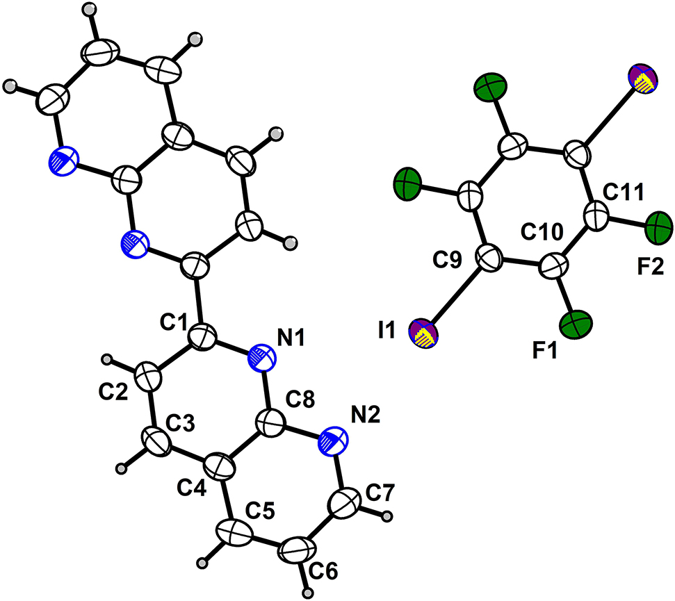 The 2,2′-bi(1,8-naphthyridine) (purity > 98%) was bought from J&K Scientific Ltd. (Beijing, China), and 1,4-diiodotetrafluorobenzene (purity > 98%) was purchased from Alfa Chemical Co., Ltd. (Zhengzhou, China). The solvent trichloromethane (analytical grade) was bought from a local chemical company. All of the chemicals were used as received. The crystalline compounds 2,2′-bi(1,8-naphthyridine) (1.29 mg, 0.005 mmol) and 1,4-diiodotetrafluorobenzene (2.01 mg, 0.005 mmol) were dissolved in approximately 10 mL of trichloromethane under gentle stirring. The solution was placed for crystallization by slow evaporation of the solvent at room temperature. After about two days, brown block crystals of title compound were obtained.