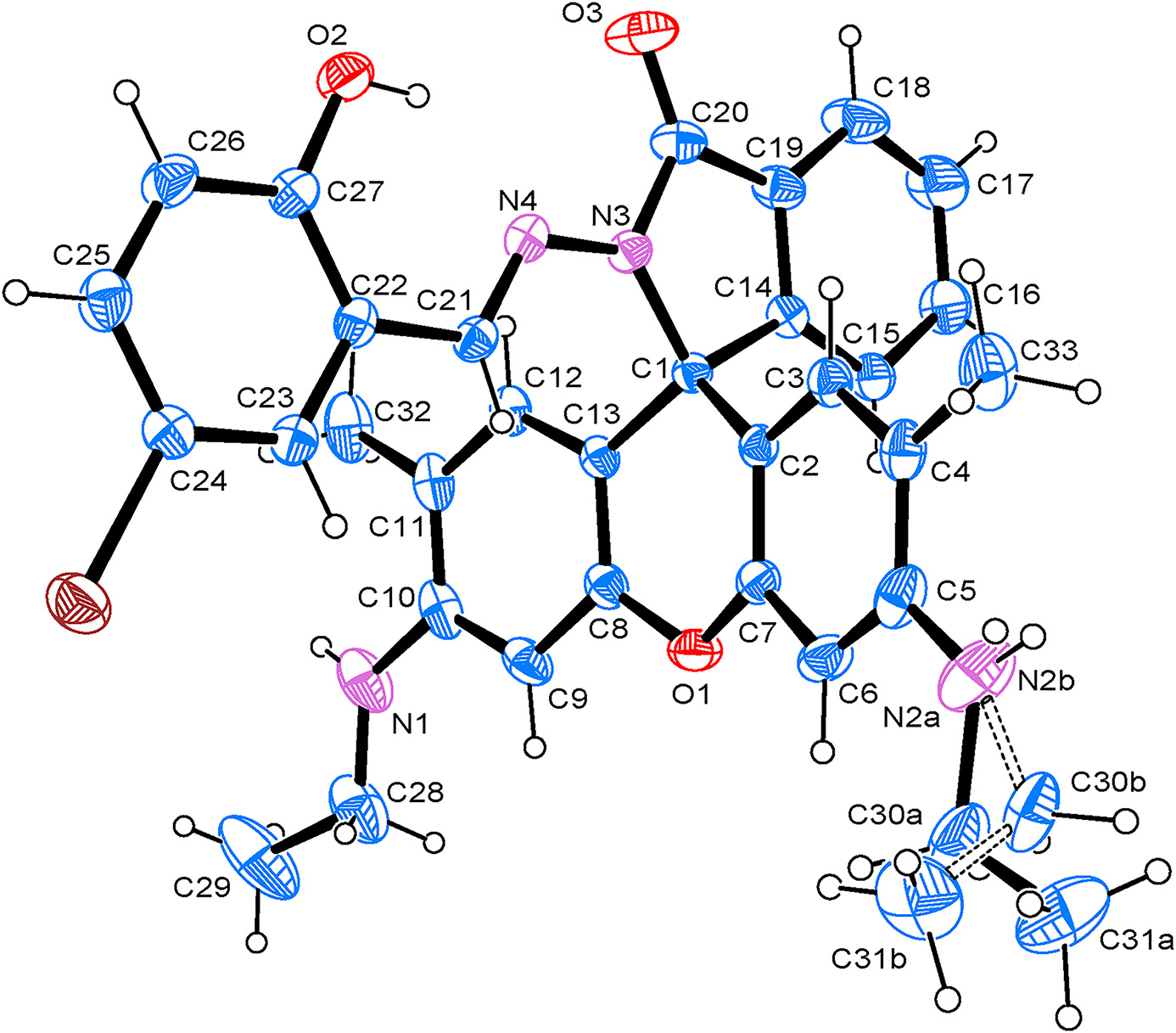 Startseite The crystal structure of (E)-2-((5-bromo-2-hydroxybenzylidene)amino)-3′,6′-bis(ethylamino)-2′, 7′-dimethylspiro[isoindoline-1,9′-xanthen]-3-one, C33H31BrN4O3