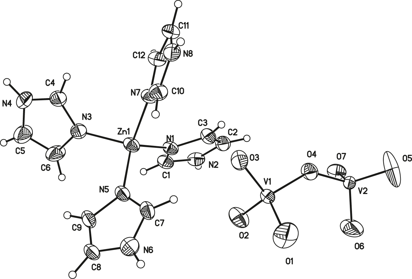 30. The crystal structure of tetra(imidazole-κ1 N)zinc(II) μ2-oxido-hexaoxido-divanadium(VI) C12H16N8O6V2Zn