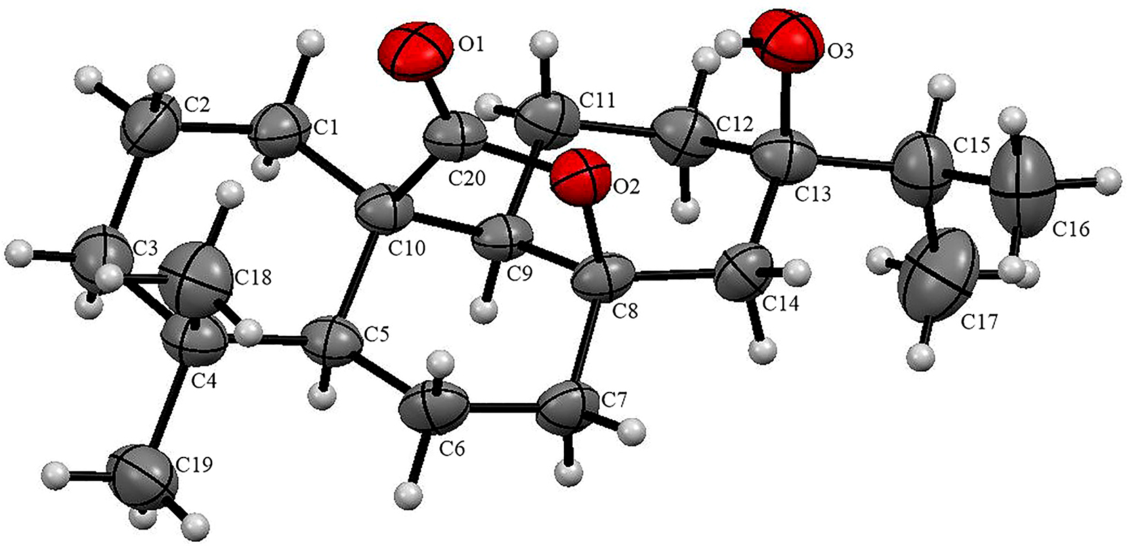 Lophanic acid is an abietane diterpenoid compound widely seen in medicinal plants I. flavidus [5] and I. lophanthoides [6]. Studies have revealed that this type of compound has significant antibacterial, anti-inflammatory, antitumor, anti-cancer, and other activities [7], [8], [9], [10], [11], [12]. The research group started from medicinal plants I. flavidus isolated rich in lophanic acid. Nevertheless, the structural modification of the active functional groups and targets of lophanic acid has not been reported in the relevant literature. Hence, to investigate the active site of lophanic acid and synthesize a highly active derivative, we used lophanic acid as a raw material. Under the action of triphenylphosphine/iodine/potassium carbonate, the C8–C9 double bond of corinoic acid was oxidized to a hydroxyl group, where the C-8 hydroxyl group formed a lactone with C-20 carboxylic acid. Finally, the target compound is obtained. The title compound (4aR,7S)-7-hydroxy-7-isopropyl-1,1-dimethyldecahydro-2H,6H-8a,4a-(epoxymethano) phenanthren-12-one was obtained by Lophanic acid oxidation, esterification reaction.