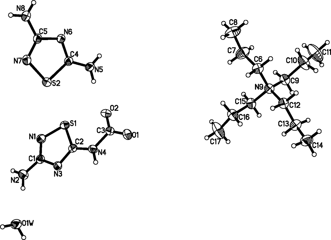 - Crystal structure of tetrapropylammonium-1,3,5-thiadiazole-5-amido-2-carbamate – 1,2,4-thiadiazole-3,5-diamine – water (1/1/1), C17H37N9O3S2