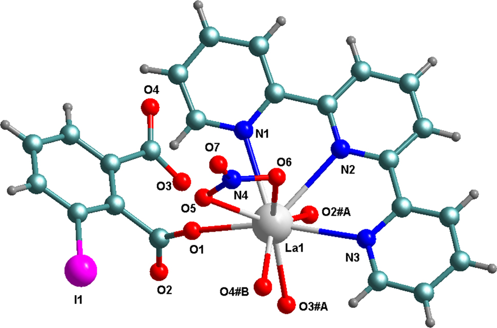As shown in the figure, the asymmetrical unit is made of one La(III) cation, one 3-iodobenzene-1,2-dicarboxylate anion, one 2,2′:6′,2″-terpyridine and one nitrate. The La(III) cation is nine-coordinated by four oxygen atoms (O1, O2#A, O3#A and O4#B, code #A: 1 − x, 1 − y, 1 − z; code #B: 1 + x, y, z) from three completely deprotonated μ 3-iodobenzene-1,2-dicarboxylate anions, two oxygen atoms from one μ 2-nitrate (O5 and O6), and three nitrogen atoms (N1, N2 and N3) from one 2,2′:6′,2″-terpyridine. The neighbouring La(III) cations are linked by μ 3-iodobenzene-1,2-dicarboxylate anions to generate chain structure, further connected by nonclassical hydrogen bonds C4–H4H7⃛O6, C7–H7⃛O7 and C20–H20H7⃛O5, with HH7⃛A distances 2.460, 2.440 and 2.643 Å, respectively. All of the bond lengths are similar to the reported results [5], [6], [7], [8], [9], [10], [11].