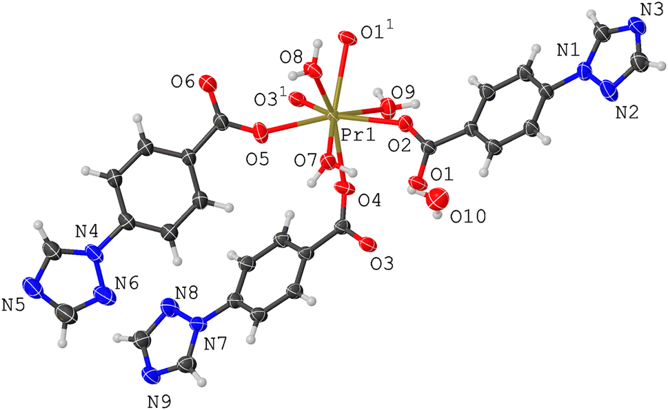 As a rigid carboxylate ligand containing triazole heterocycle, 4-(1H-1,2,4-triazol-1-yl)benzoic acid (Htba), has been applied to build metal complexes with various ions [5], [6], [7], [8]. However, to the best of our knowledge, only limited lanthanide metal (Nd3+/Sm3+/Tb3+) complexes were reported [9, 10]. To enrich the Ln-series of the structure based on Htba ligand, the title 1D Pr(III)-complex was synthesized.