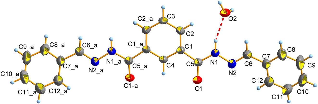 Herein, a novel aroylhydrazone compound was synthesized and characterized by single-crystal X-ray diffraction [1], [2], [3]. In the crystal, the molecule exhibits crystallographic twofold axial symmetry where C(3) and C(4) are located. The title molecule is the solvtomorph of the corresponding methanol containing compound [7]. The title molecule is non-planar and the dihedral angle between rings C1–C4 and C7–C12 is