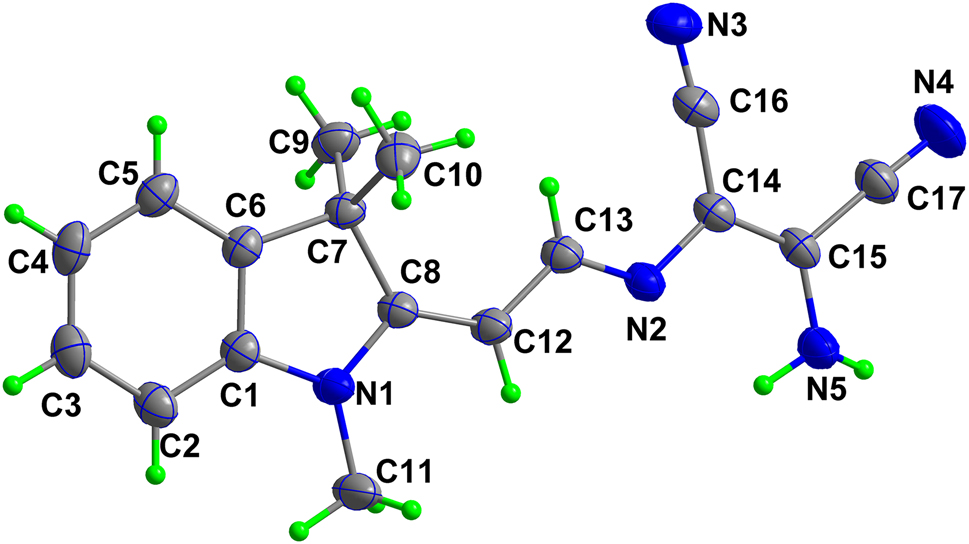 - Crystal structure of 2-amino-3-[2-(1,3,3-trimethyl-1,3-dihydro-indol-2-ylidene)-ethylideneamino]-but-2-enedinitrile, C17H17N5