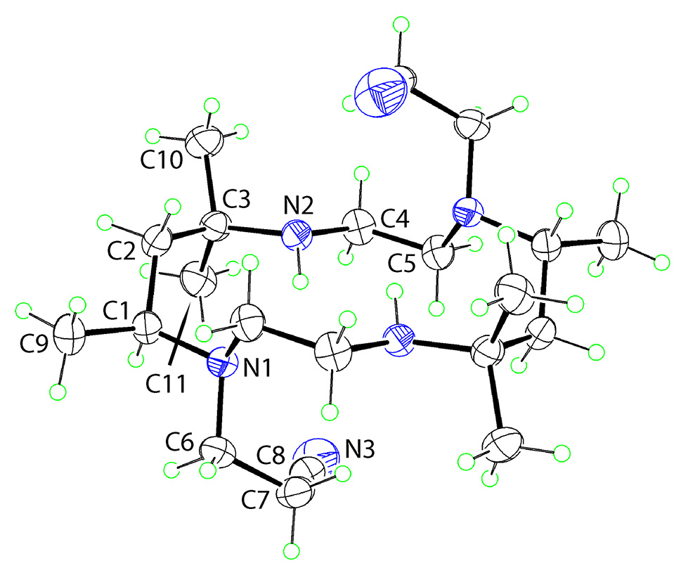 The molecular structure is shown in the figure (35 % probability ellipsoids). The unlabelled atoms in the figure are related by the symmetry operation −x, 1 − y, 1 − z as the molecule is disposed about an inversion centre. The four nitrogen atoms define a plane and participate in intramolecular secondary-amine–N–H⃛N (teriary amine) hydrogen bonds [N2–H2n⃛N1: H2n⃛N1 = 2.298(13) Å, N2⃛N1 = 2.9916(15) Å with angle at H2n =