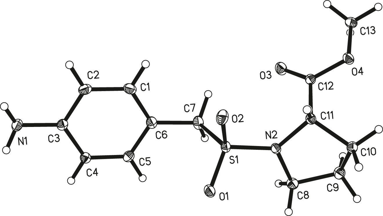 The ORTEP diagram is presented in the Figure. Bond lengths and angles are all in the expected ranges [6]. The whole molecule contains two parts, p-aminobenzenesulfonyl and methyl L-prolinate, linked by N(2)–S(1). The bond length of N(2)–S(1) is 1.6096(15) Å. The bond angle of C(7)–S(1)–N(2) is 106.80(8)° [7]. For the p-aminobenzenesulfonyl side, the amino group at the C(3) position is obtained by reduction of the nitro group, and can act as a proton donor and form hydrogen bonds with other atoms [8, 9]. For the methyl L-prolinate, the C(11) is the chiral center and the molecule adopts the L stereoselective configuration. The carboxyl methyl ester at the C(11) can improve the molecular lipid solubility.