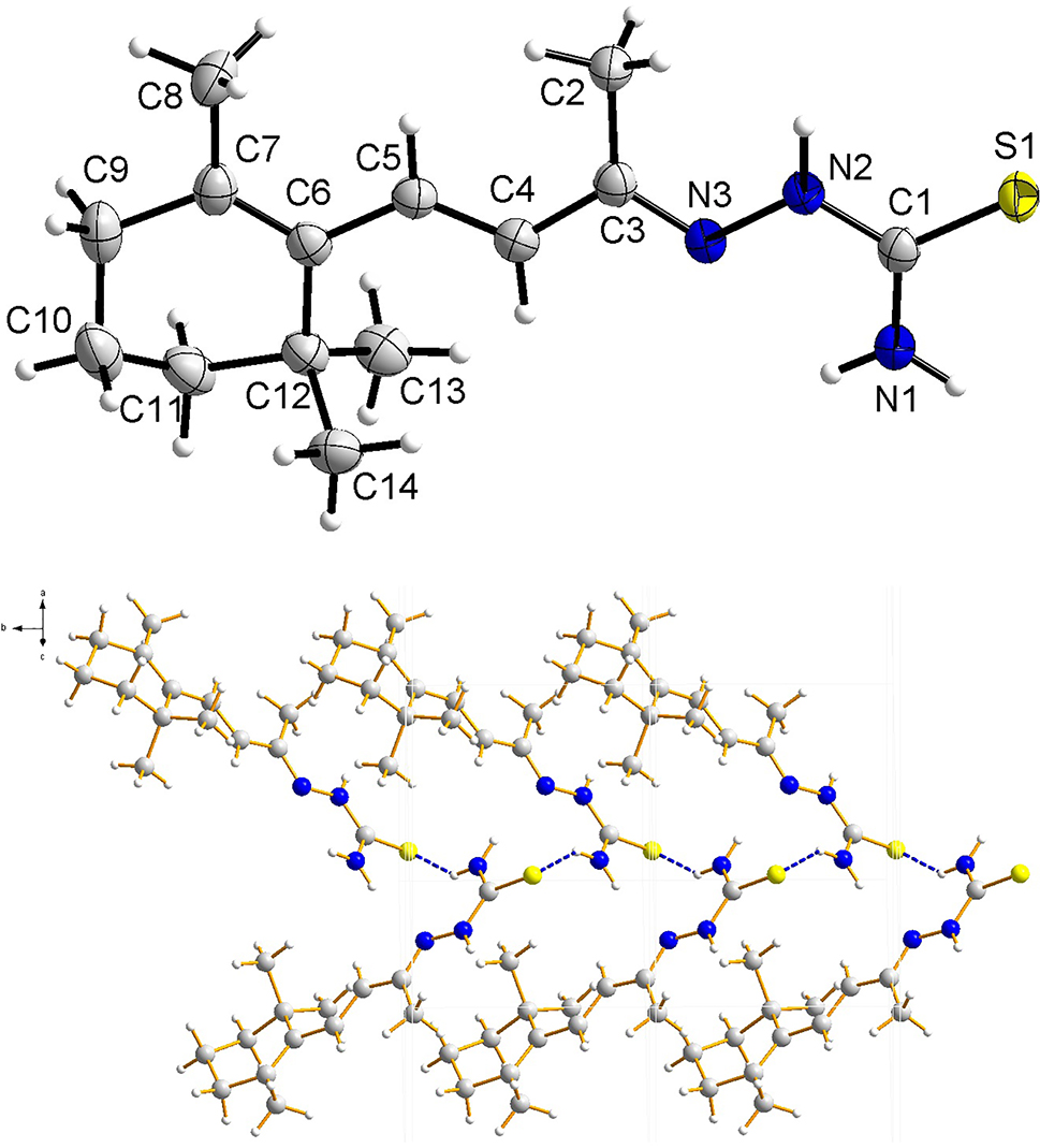 Thiosemicarbazone compounds have good fungicide, insecticidal, antiviral and other biological activities, and occupy an important position in the pesticide market [5], [6], [7]. For instance, Tabatabaee M. et al. have reported the structure of 4–Amino-6-methyl-3-thio-3,4-dihydro-1,2,4-triazin-5(2H)-one [8]. Jouad E. M. et al. have reported the structure and antifungal activity of nickel(II) complexes with 5-methyl-2-furfural thiosemicarbazone [9]. However, most of the compounds in these studies are heteroatom containing five membered ring thiosemicarbazones structures [10, 11], while there are relatively few studies on six membered ring thiosemicarbazones structures. Hashimoto H. et al. have reported the structure of β-ionylidene-2,4-dinitrophenylhydrazone [12].