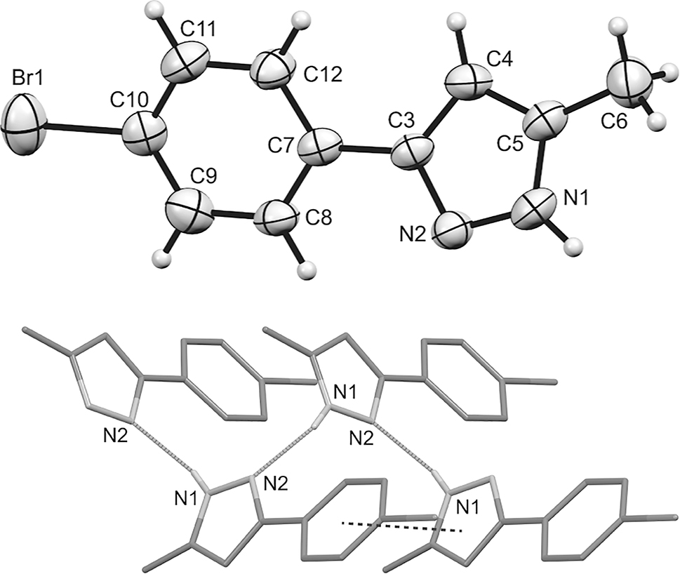 Pyrazole and its derivatives have important pharmacological properties [7]. They bonds to metal atoms as monodentate or bridging bidentate ligands [8]. Strong affinity towards metals may lead to the formation of metal-organic frameworks [9]. N–H⃛N hydrogen bonding is prevalent interaction in the assembly of pyrazolyl molecules [10]. Their hydrogen bonding capacity may lead to the formation of extended molecular networks [11]. Substituents at the pyrazole ring give more possibilities for supramolecular arrangements. Between phenyl-pyrazole molecules stacking interactions are possible [12]. Addition of bromine to phenyl ring may lead to the halogen bonding [13]. Their variability in coordination modes extends their coordinative properties [14]. Phenol-pyrazole ligands influence the structural and magnetic properties of transition metal complexes [15, 16]. Brominated phenyl pyrazoles serve as ligands in the synthesis of molecular magnets [17, 18]. Steric effects of the phenol-pyrazoles, are important for the structural variability of the coordination compounds [19]. As a continuation of our work in the structural and supramolecular properties of the phenyl pyrazole molecules [20, 21], we are reporting the crystal and molecular structure of the 3-(4-bromophenyl)-5-methyl-1H-pyrazole. Bond lengths in the title molecule follow the pattern like in related bromophenyl-1H-pyrazole derivatives [22], [23], [24]. As in the crystal structure of [22], in the title molecule there are no Br⃛Br interactions. But, in the crystal structures of [23, 24] the Br⃛Br interaction of type I [25] is present, θ1 = θ2 = 163° in Ref. [23] and θ1 = θ2 = 156° in Ref. [24]. Molecules of the title compound are connected through the N1–H1⃛N2 i (the H⃛N distance is 2.24 Å, the N–H⃛N bond angle is 160°), (i = −1/2 + x, 1/2 − y, 1 − z). View along the c axis (lower part of the Figure) shows assembly of molecules into zigzag chain. Dotted black line depicts the closest phenole-pyrazole intermolecular distance. Centroids of the phenol and pyrazole rings from neighboring molecules are at a distance of 4.158(4) Å. Angle between the mean planes of the neighboring rings is 18.0(3)°. Such an arrangement of two cycles creates an opportunity for stacking interaction between their π-systems. Molecular chains are directed along the axis a. There are no significant inter-chain contacts. Br atom is not involved in significant intermolecular interactions.