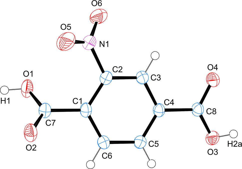 Nitroterephthalic acid crystallizes in the monoclinic space group C2/c and the asymmetric unit contains one molecule of nitroterephthalic acid. The COOH group meta to the nitro position displays disorder with the hydrogen atom being found equally on either of the two oxygen atoms. In the diagram of the asymmetric unit, one of the two disordered positions has been omitted. All bond lengths in the structure are standard. Each nitroterephthalic acid molecule is hydrogen bonded to an adjacent molecule via a COOH⃛COOH homosynthon. The molecules arrange themselves in 1–D chains with alternating inversions and two-fold rotations. The centre of inversion and rotation axes are respectively found at the centre of the successive COOH⃛COOH homosynthons.
