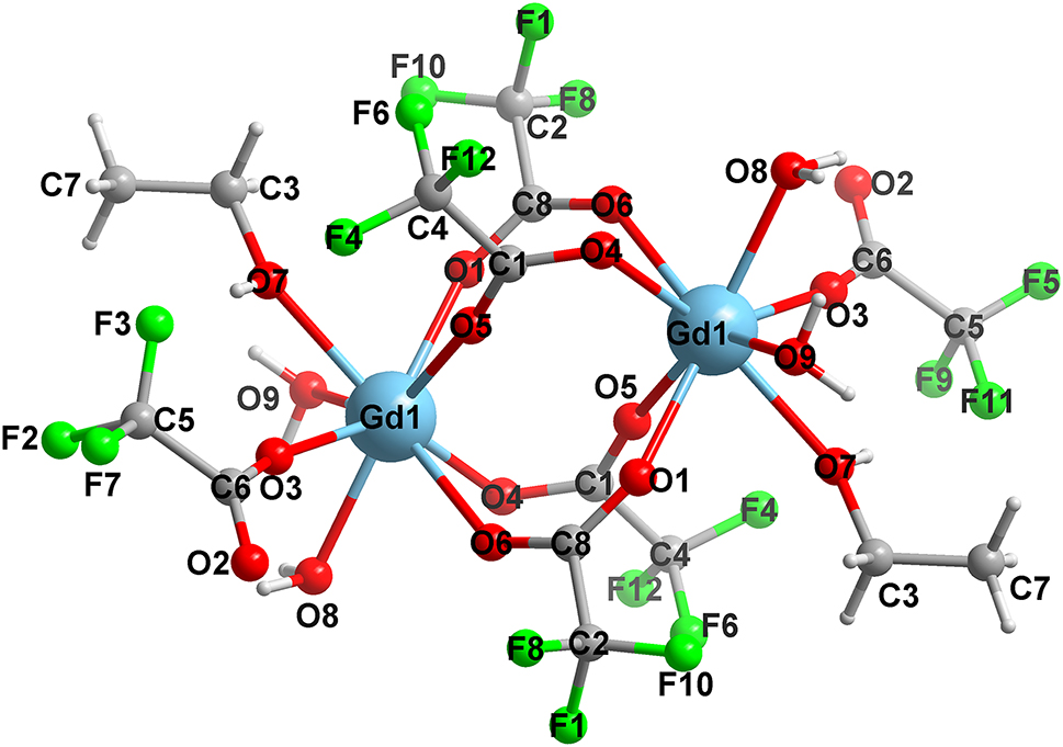 This compound is composed of six trifluoroacetate ligands, two ethanol, four water molecules and two Gd metal atoms. The gadolinium center is octahedrally coordinated by two oxygen atoms of bridging trifluoroacetate ligands and four oxygen atoms from two water molecules, one trifluoroacetate ligand and one ethanol molecule. The distances of Gd–O bonds are in range of 2.328–2.451 Å [8].