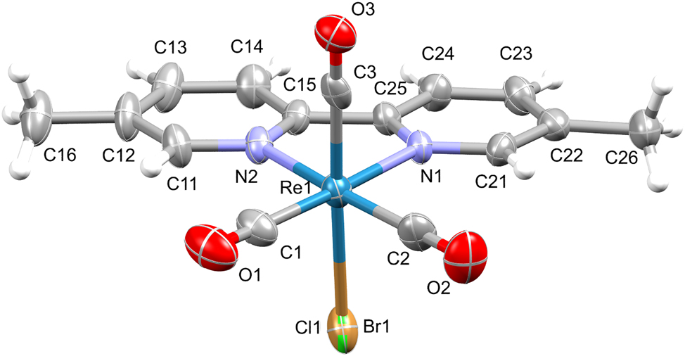 The synthesis of the starting synthon, fac-[NEt4]2[Re(CO)3(Br)3], was strictly performed under Schlenk conditions. The reported complex was synthesized according to published procedures [6, 7]. To fac-[NEt4]2[Re(CO)3(Br)3] (251 mg, 0.325 mmol) in methanol 5,5′-dimethyl- 2,2′-bipyridyl (bid; 119 mg, 0.648 mmol) was added and refluxed for 6 h at room temperature. The light-yellow precipitate was filtered off, dried, and weighed to yield the title complex. Crystals were obtained by recrystallization using warm methanol and dilute HCl solution and allowing the resultant solution to crystallize at room temperature. The molecular structure of fac-[Re(CO)3(5,5′-DiMBpy)(Cl0.82Br0.18)] was confirmed with SCXRD. Yield: 289 mg, IR (ATR, cm−1): vCO = 2024.8, 1900.8.