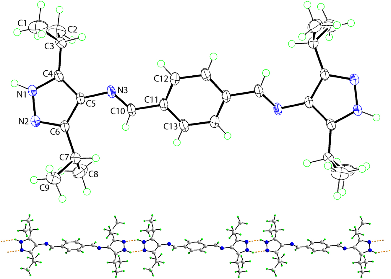 Recently, the crystal structure of amine group-introduced pyrazole, i.e. 4-amino-3,5-diisopropyl-1-pyrazole (L1HpzNH2) was described [5]. The compound was obtained by the reduction 4-nitro-3,5-diisopropyl-1-pyrazole with iron powder [5]. The synthetic method and structure of this molecule can be compared to the analogous molecule with methyl groups replacing the isopropyl substituents, i.e. 4-amino-3,5-methyl-1-pyrazole [6]. Originally, 4-amino-3,5-methyl-1-pyrazole was obtained by the direct nitration of acetylacetone with sodium nitrite (NaNO2). This amino group can readily react with aldehydes to generate covalent organic frameworks [7], [8], [9]. Thus, L1HpzNH2 can react readily with terephthalaldehyde (benzene-1,4-dicarboxaldehyde) to yield the title compound I; systematic name: (NE)–N-[(4-{N-[3,5-bis(propan-2-yl)-1H-pyrazol-4-yl]carboximidoyl}phenyl)-methylidene]-3,5-bis(propan-2-yl)-1H-pyrazol-4-amine.