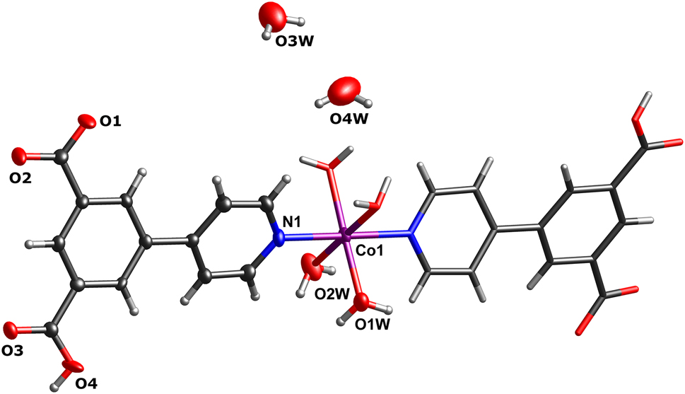The asymmetric unit consists of half of a Co(II) center located on a crystallographic twofold axis, one partial deprotonated H2pipa ligand, two coordinated water molecules and two free water molecules (see the figure). The Co(II) center has a distorted octahedral coordination geometry, which is connected to four oxygen atoms from two pairs of symmetry related water molecules (Co—O = 2.081(6)—2.104(6) Å), and two nitrogen atoms from two symmetry related Hpipa ligands (Co—N = 2.145(4) Å). The carboxylic acid groups in the Hpipa ligand do not participate in the coordination, and thus form a zero-dimensional structure. In the crystal structure, O—H⋯O hydrogen bonds link the tile molecules into a three dimensional supermolecular framework.