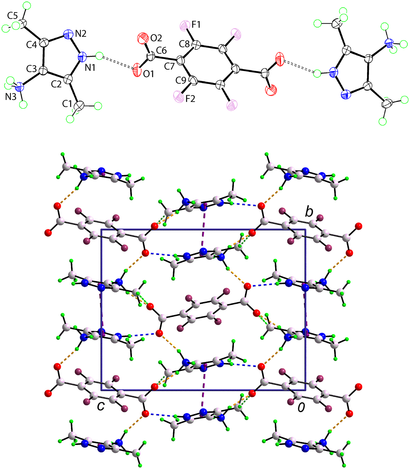 The molecular structures of the constituents of salt (I) are shown in the upper view of the figure (70 % displacement ellipsoids, dashed lines indicate N–H⋯O hydrogen bonds and unlabelled atoms are related by the symmetry operation – x, 1 – y, 1 – z). The asymmetric-unit comprises a 3,5-dimethyl-1H-pyrazol-4-ammonium cation, in a general position, and half a 2,3,5,6-tetrafluorobenzene-1,4-dicarboxylate dianion, being situated about a centre of inversion. The confirmation of proton transfer during co-crystallisation is evident in the near equivalence of the C6–O1,O2 bond lengths [1.2498(13) & 1.2381(13) Å] and the wider angle at the N1 atom [C2–N1–N2 = 113.09(9)∘] compared with that at the N2 atom [C4–N2–N1 = 104.80(9)∘].