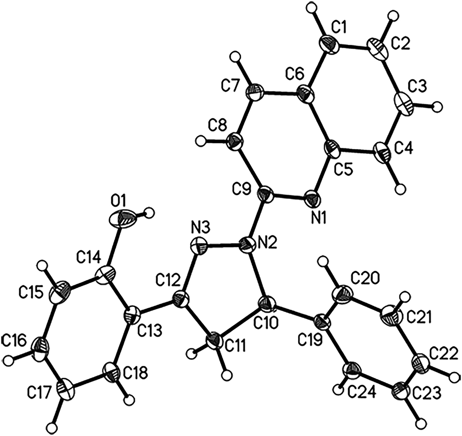 The title compound crystallizes in the monoclinic space group P21/c with one molecule in the asymmetric unit (see the Figure). Bond lengths and angles are all in the normal range. A pyrazoline group as the five-membered core ring is formed by addition cyclization reaction of chalcone and hydrazine. The bond length of C12–N3 (1.2970 Å) indicates the existence of C=N in the pyrazoline ring, which is typical for similar compounds [11], [12], [13]. The pyrazoline ring is close to being planar with the largest deviation from the mean plane being 0.0883° for atom C10. In addition to the pyrazoline ring, it is substituted by a quinoline group, and a phenyl group and a phenol-2-yl group. The pyrazoline ring makes dihedral angles of 9.9° and 19.2° with the phenol and quinoline rings, respectively. Due to the steric hindrance effect, the benzene ring is almost perpendicular to the attached pyrazoline ring, showing a dihedral angle of approximately 103.9°. Phenolic hydroxyl group forms an intramolecular hydrogen bond to the pyrazoline N3 atom [O1⋯N3: 2.6656(16) Å]. ππ interactions are observed for parallel quinoline rings with the centroid-centroid distance between the two pyridine moieties of 3.66 Å.