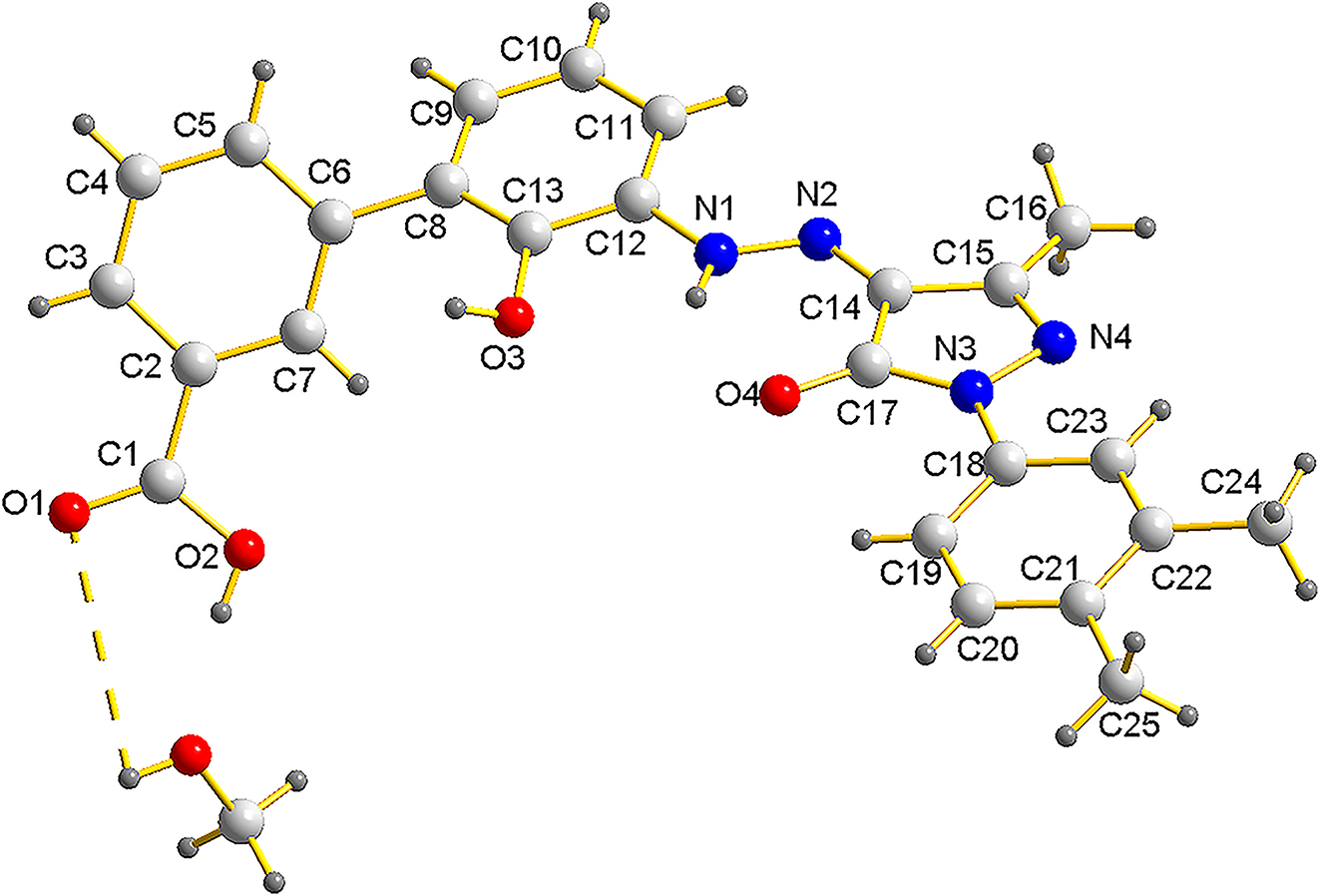 All reagents for the synthesis were commercially procured and used without further treatment. A solution of 3′-amino-2′-hydroxy-1,1′-biphenyl-3- carboxylic acid (1.0 g, 4.36 mmol) in methanol (20 mL) was stirred at 0–5 °C, 4 M hydrochloric acid (2.9 g, 10.73 mmol) was added. A solution of sodium nitrite (0.31 g, 4.36 mmol) in water (2 mL) was added over 20 min. The reaction was stirred at 0–5 °C for 1 h. Triethylamine (0.8 g, 7.85 mmol) was added to bring the pH to 8–9 and 2-(3,4-dimethylphenyl)-1,2-dihydro-5-methyl-3H-pyrazol-3-one (0.79 g, 3.93 mmol) was added in one portion. The mixture was stirred for 3 h at 15–25 °C maintaining the pH 8–9. After the reaction was over, 4 M hydrochloric acid was added dropwise to adjust the pH to 1.5–2. The temperature was kept for 1 h, the precipitate was filtered, washed with water and dried at 45 °C to yield (Z)-3′-(2-(1-(3,4- dimethylphenyl)-3-methyl-5-oxo-1,5-dihydro-4H-pyrazol-4-ylidene)hydrazinyl)-2′-hydroxy-[1,1′-biphenyl]-3-carboxylic acid (1.70 g, 88 % yield) as a yellow solid. 0.5 g of (Z)-3′-(2-(1-(3,4-dimethylphenyl)-3-methyl-5-oxo-1,5-dihydro-4H-5-pyrazol-ylidene)hydrazinyl)-2′-hydroxy-[1,1′-biphenyl]-3-carboxylic acid was dissolved in 20 mL of methanol. After filtration, the solution was left to evaporate slowly at room temperature with the cap being left only slightly open. After a period of 7 days, yellow crystals of the title compound were obtained.