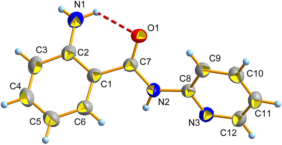 In the crystal structure, the title molecule is non-planar and the dihedral angle between rings C1–C6 and C8–N3 is 65.55(3)°. The NH group of the aniline moiety participates in an intramolecular N–H⃛O hydrogen bond (H1a⃛O1 = 2.2723 Å) to the oxygen atom of the amide group. The bond lengths of N(1)–C(2), O(1)–C(7), N(2)–C(7), C(7)–C(1), N(2)–C(8), N(3)–C(8) and N(3)–C(12) are 1376(2) Å, 1.2273(17) Å, 1.3709(18) Å, 1.4864(19) Å, 1.4023(17) Å, 1.3383(18) Å and 1.3437(17) Å, respectively. The bond angles of O(1)–C(7)–N(2), O(1)–C(7)–C(1), N(2)–C(7)–C(1) and C(8)–N(3)–C(12) are 123.08(12)°, 122.15(11)°, 114.76(10)° and 117.26(11)°. All geometric parameters are in the expected ranges. 9 , 10