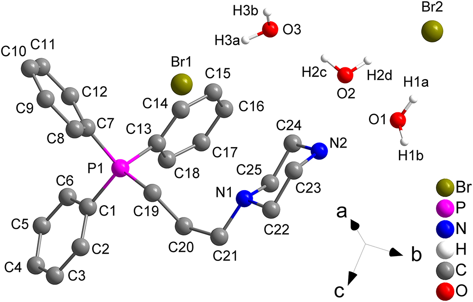 Each asymmetric unit contains one triphenylphosphonium group, one piperazinium group two bromide anions and three water molecules. The C–C distances are in the range of 1.338(14)–1.544(11) Å. The C–N distances are in the range of 1.422(12)–1.498(11) Å. 8 The C–P distances are in the range of 1.777(8)–1.792(9) Å. 9 The title molecule was assembled into a twisted structure by five hydrogen bonds. First hydrogen bond is O1–H1B–Br1, the distance of O1–H1B bond is 0.85 Å, the distance of H1B–Br1 bond is 2.56 Å, the angle of O1–H1B–Br1 is 166°. 10 Second hydrogen bond is N2–H2A–Br1, the distance of N2–H2A bond is 0.89 Å, the distance of H2A–Br1 bond is 2.52 Å, the angle of N2–H2A–Br1 is 163°. 11 Third hydrogen bond is O3–H3B–Br2, the distance of O3–H3B bond is 0.85 Å, the distance of H3B–Br2 bond is 2.46 Å, the angle of O3–H3B–Br2 is 167°. Fourth hydrogen bond is C19–H19A–N1, the distance of C19–H19A bond is 0.97 Å, the distance of H19A–N1 bond is 2.55 Å, the angle of C19–H19A–N1 is 108°, this hydrogen bond is an intramolecular hydrogen bond. Fifth hydrogen bond is C19–H19B–Br2, the distance of C19–H19B bond is 0.97 Å, the distance of H19B–Br2 bond is 2.79 Å, the angle of C19–H19B–Br2 is 154°.